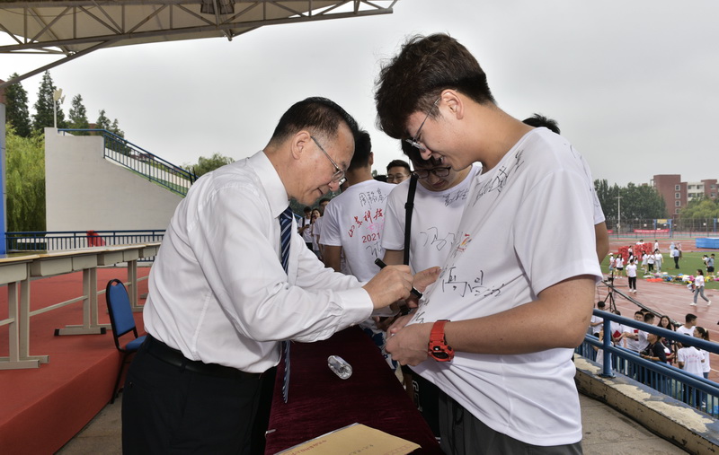 校领导、校党委领导班子成员罗公利、姚庆国、尹华、周东华、夏侯雪娇、孙鹤汀、张英杰、李玉霞、曾庆田、李克周、陈涛及有关部门、各学院主要负责人在主席台就座。来自全国各地的100余名校友组成“观礼团”现场为毕业生送上美好祝愿。全体毕业生身着统一文化衫,齐聚体育场,再一次聆听领导老师的谆谆教导、殷殷叮咛,感受母校的深情厚意。校党委书记罗公利、校长姚庆国为部分毕业生签名并合影留念。