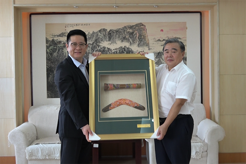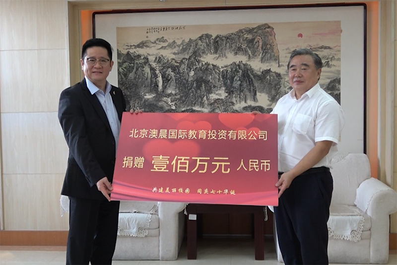 捐赠仪式上,李新庆代表北京澳晨国际教育投资有限公司捐赠100万元支持学校教育事业发展,并转赠了友好合作院校塔斯马尼亚大学和斯威本科技大学的校庆纪念礼物,姚庆国代表学校接受捐赠,并回赠捐赠证书。