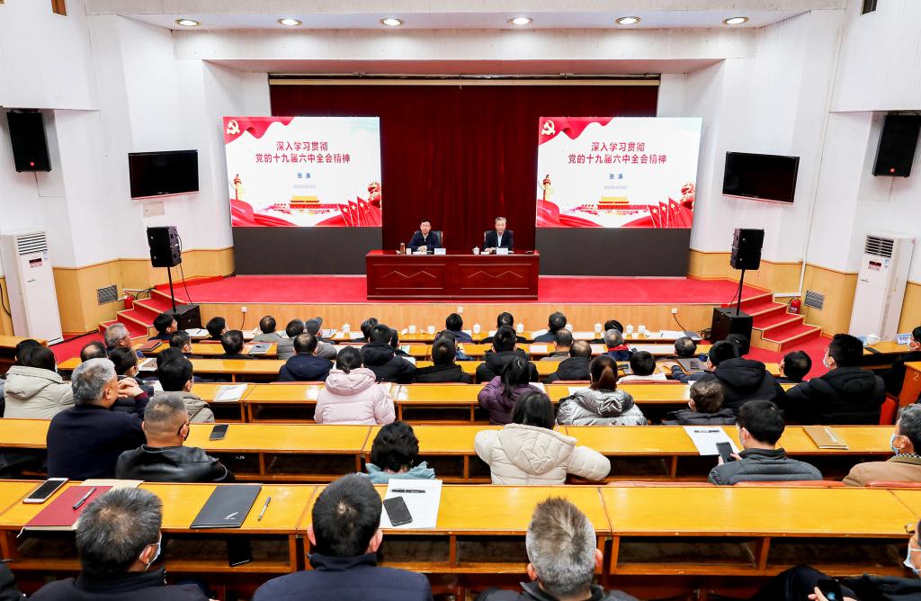 张涛指出,党的十九届六中全会是在“两个一百年”奋斗目标历史交汇关键节点上,召开的一次具有重大历史意义的会议。全会提出要牢记“中国共产党是什么、要干什么”这个根本问题,向全体党员发出不忘初心、牢记使命、继续奋斗的进军号令。强调“两个确立”,反映了全党全军全国人民的共同心愿。用“三个理论飞跃”“四个伟大飞跃”概括了百年党史的伟大成就,并从五个方面阐述了党百年奋斗的历史意义,用“十个坚持”总结了党的百年历史经验。我们要在学思践悟中牢记“四个必须”,践行“十个坚持”,遵循“十个明确”,响应“一个号召”,努力为实现第二个百年奋斗目标,为实现中华民族伟大复兴的中国梦贡献力量。