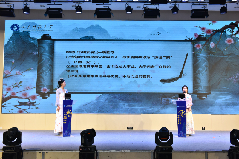 开场即惊艳。“‘蓬莱文章建安骨,中间小谢又清发’一诗中的‘小谢’是谁?”“谢朓!”“‘梅子金黄杏子肥’的下一句是?”“麦花雪白菜花稀!”……参赛者们文思敏捷,凭借扎实的诗词功底、沉着的应答策略,抢答得分,你追我赶。经过激烈角逐,4位选手成功晋级半决赛。高手对决,句句飞“花”,满腹诗情,心系“国”风,展现出超凡的诗词阅读量。“飞花令”进行数十个回合后,冠亚军争夺者方脱颖而出,观现场作画以解谜悟诗,聆相关线索去寻真猜句,赛场加时竞争已然白热化,最终文法学院汉语言文学2021级学生崔俪檬获得冠军。