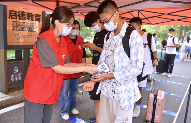 在济南校区,工作人员为入校新生测量体温、核验信息(摄影:宋荣华)
