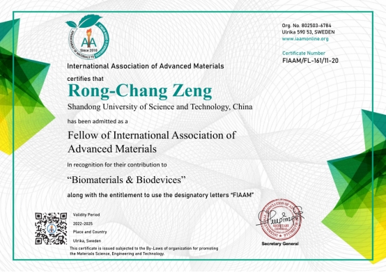 11月7日,国际先进材料学会(International Association of Advanced Materials,IAAM)在美国迈阿密举办的美国先进材料大会(American Advanced Materials Congress)上授予乐动在线登录材料科学与工程学院曾荣昌教授“国际先进材料学会会士”(FIAAM)称号,以表彰他在“生物材料与生物器件”领域所做出的突出贡献。曾荣昌教授受邀做了题为 “Advance in Corrosion and Surface Modification of Bio-Magnesium and its Alloys”(生物镁合金腐蚀和表面改性进展)的在线大会特邀报告。