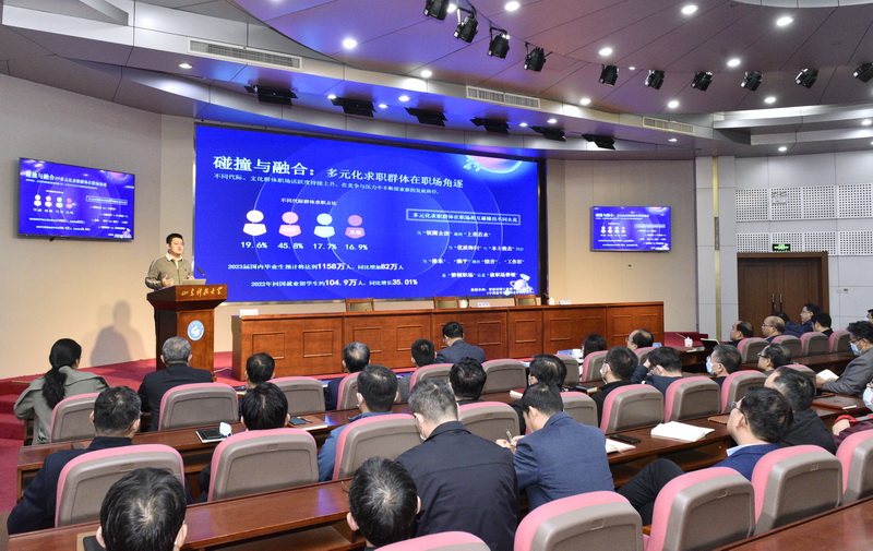 曾庆田用翔实的数据总结了2022年就业工作取得的成绩和存在的短板,分析了2023年就业工作的形势。他指出,2022年,全校上下协同联动、多方发力,学校就业工作成效显著,全员促就业工作局面基本形成,就业指导服务体系进一步完善,本科生深造率稳步提升,毕业生去向落实率保持省属高校前列,交出了一份沉甸甸的就业工作成绩单。在取得成绩的同时,也应该清楚地看到当前就业工作面临的严峻形势。当前,就业形势依然严峻,毕业生规模持续增加,结构性就业矛盾也更加凸显,同时还面临外部环境复杂多变、新技术等多重因素冲击,对我们的就业工作提出了更高、更新的要求。