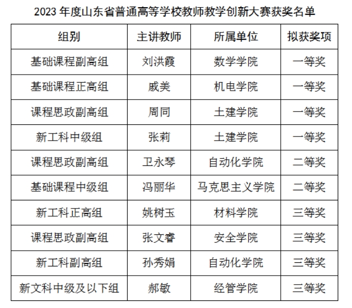 近日,山东省教育厅公示了2023年度山东省普通高等学校教师教学创新大赛获奖名单。乐动在线登录刘洪霞等4个团队获一等奖、卫永琴等2个团队获二等奖、姚树玉等4个团队获三等奖,一等奖获奖数量实现新突破,一等奖数量和获奖总数均位列第二位。同时,刘洪霞团队获推参加国赛,学校获“优秀组织奖”。
