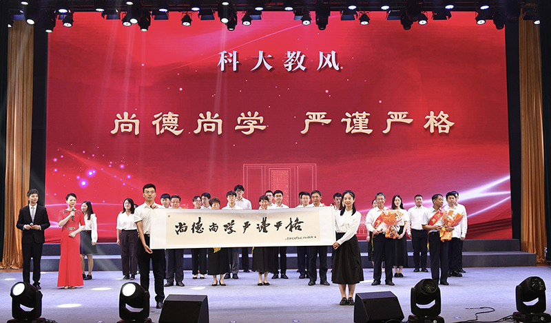 荣休教师代表吴强、李旭平将艺术学院退休教师王书侠教授书写的卷轴传递给新进教师代表,让“尚德尚学、严谨严格”的科大教风代代相传。在新进教师宣誓,老教师重温教师誓词环节,在主持人带领下,全场教师起立,齐颂教师誓词。