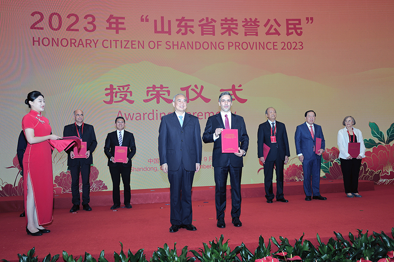 9月28日下午,2023年“山东省荣誉公民”授荣仪式在济南举行,省委书记林武,省委副书记、省长周乃翔出席仪式,纳赛尔受邀参加授荣仪式。仪式上,林武为纳赛尔颁发荣誉证书。授荣仪式结束后,纳赛尔受邀参加了省政府国庆招待会,并向省领导汇报了我校在中伊教育、科技、文化以及人才培养方面所作出的卓越贡献,受到省领导肯定和赞赏。