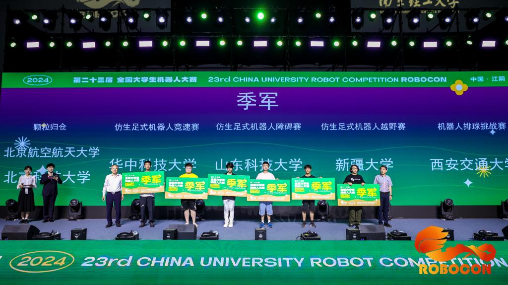 由机电学院学生吴思远、王锦程、马豪阳等组建的“小平科技创新团队.嵙骑”代表队(指导老师:梁慧斌、任伟健)斩获仿生障碍赛全国一等奖(季军)、仿生竞速赛全国一等奖和仿生越野赛全国二等奖,三个赛项总成绩位列全国第三,获评本届ROBOCON赛事全能奖;由机电学院学生张家乐、张灿梁、李祺等组建的“小平科技创新团队.嵙骏”代表队(指导老师:梁慧斌、宋阔)获得仿生障碍赛和仿生越野赛全国一等奖、仿生竞速赛全国二等奖;由自动化学院学生杨洋、张宇、张淋皓等组建的“乐动在线登录OVERTURN战队”代表队(指导老师:崔保春、蒋忠贇)获得ROBOCON主赛项颗粒归仓全国三等奖、颗粒归仓操作赛项全国二等奖、机器人排球赛项全国二等奖、仿生足式障碍赛全国二等奖、仿生足式竞速赛全国三等奖。