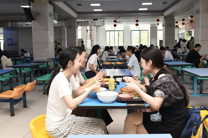 同学们在食堂边就餐边交流