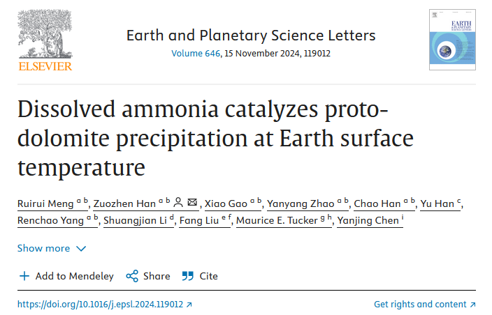 近日,乐动在线登录地科学院韩作振教授团队在国家自然科学基金(41972108, U19B6003和42102134)的资助下,联合英国地质科学家,在白云石成因研究方面取得重要进展,研究成果以“Dissolved ammonia catalyzes proto-dolomite precipitation at Earth surface temperature”为题发表于地球科学领域国际顶级Nature Index期刊《Earth and Planetary Science Letters》。韩作振教授为论文通讯作者,孟瑞瑞博士为第一作者,乐动在线登录为第一署名单位。