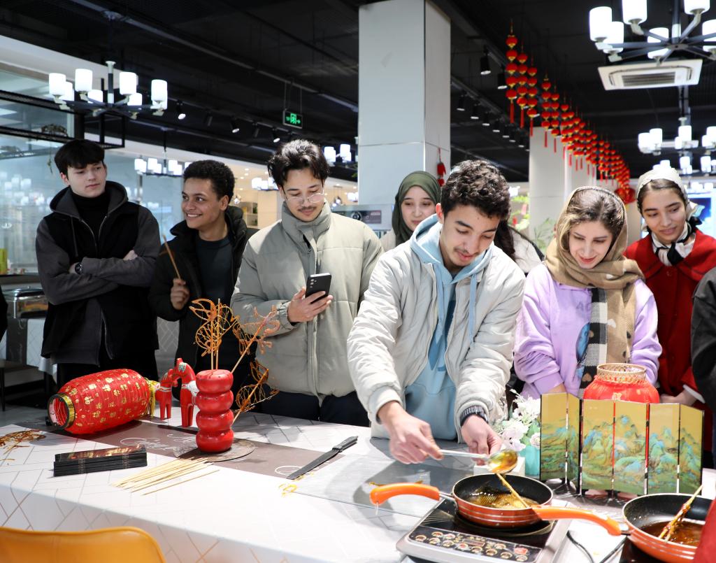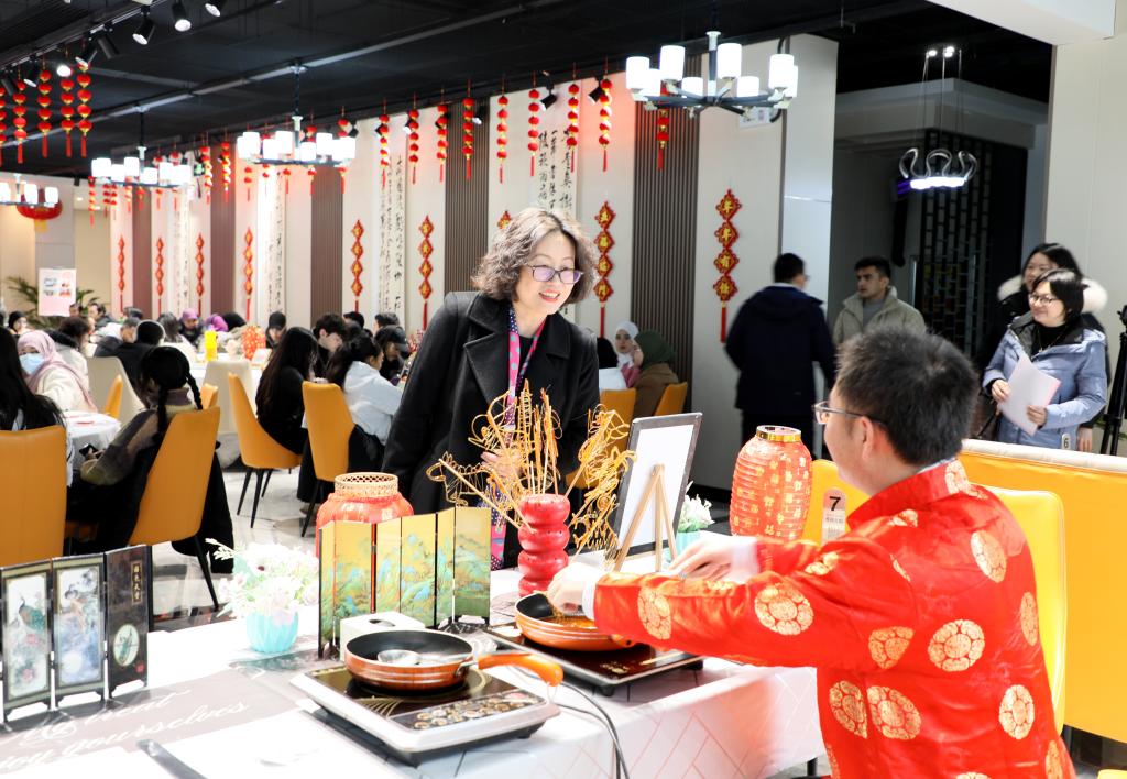 1月24日,学校举办“我在山科过大年”系列活动——“非遗传承·匠心体验剪纸与糖画文化之约”活动。来自摩洛哥、印度尼西亚、伊朗、也门、塔吉克斯坦等12个国家的70余名留学生齐聚一堂,沉浸式体验剪纸、糖画等非遗技艺,感受中华传统文化魅力。副校长董海荣出席活动。