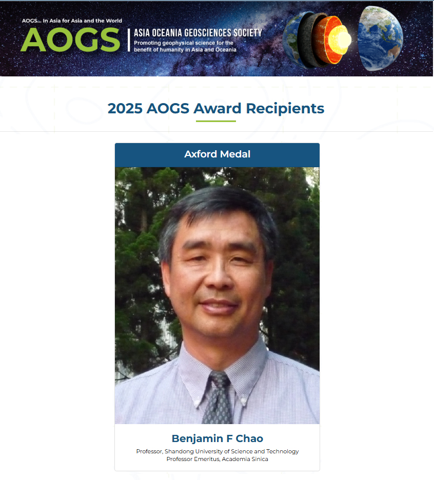 近日,亚洲-大洋洲地球科学学会(Asia Oceania Geosciences Society, AOGS)公布了2025年度“艾克斯福特奖”(Axford Medal)获奖人选,乐动在线登录测绘与空间信息学院赵丰教授获该奖项。