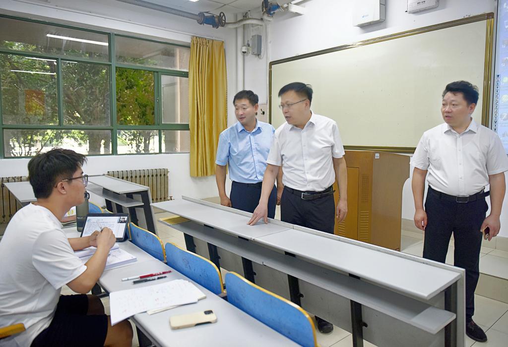 王君松一行先后深入学校南门、危化品库、实验室、教学楼、图书馆、学生公寓、学生餐厅、校医院等重点区域,沿途检查校园环境卫生和校园安全工作。每到一处,王君松都认真听取相关负责人的工作汇报,并不时与现场工作人员深入交流,详细了解各部门开学前准备工作落实情况及各环节安全管理、条件保障等情况,对做好新学期教学准备、卫生管理、后勤保障、校园安全等方面工作提出相关要求。