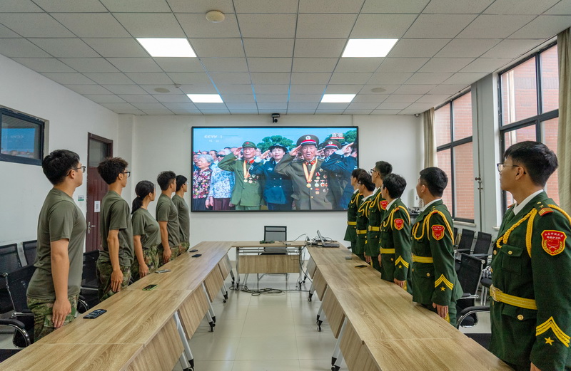 在会议室、教室、报告厅、实验室等集中观看现场,广大师生员工全神贯注聚焦屏幕,观看阅兵式直播画面。受阅部队铿锵有力的步伐、现代化武器装备的亮相,引来会场阵阵赞叹声。
