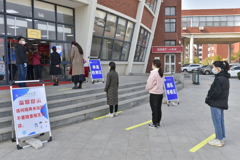 在学生返校进入校园的检测查验演练场景中,安全管理组工作人员设置回形隔离等待通道和醒目标识,提醒学生佩戴口罩、相互间隔1米以上;学生管理组工作人员指导学生在排队时抽取酒精消毒湿巾对随身行李等自行擦拭消毒;健康检测组工作人员查验学生电子健康通行码,进行体温检测,体温正常、核验成功人员,进入校园。