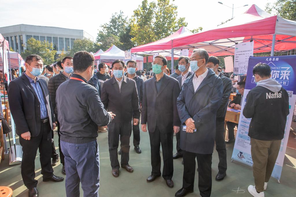 10月25日,“多彩校招”2020年山东省高校毕业生集中招聘活动专场暨乐动在线登录泰安校区毕业生供需见面会在泰安校区东校园排球场举行。校党委副书记兼泰安校区党工委书记、管委主任王少鹏,山东省公共就业和人才服务中心就业服务处副处长杨高扬,泰安市人才交流中心主任徐太国到供需见面会现场指导工作,看望用人单位及求职学生,并与用人单位负责人和现场毕业生进行交流。