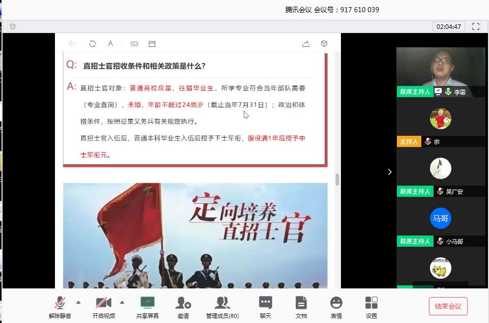 以思想领航,切实做到参军理想入脑入心。疫情期间,乐动在线登录扎实抓好线上思想政治教育和国防教育,组织全体学生观看《全国大学生同上一堂疫情防控思政大课》,为每位同学推送大学生国防教育推文,推选国防大学、国防科技大学军事专家为学生讲授的线上国防教育专题讲座,引导学生树立崇军拥军价值观。举办参军入伍先进事迹网络报告会,邀请四名考入军校的同学做客“青春讲堂-成长在军营”网络课堂,强化学生爱国担当精神,切实做到征兵信息入眼入耳。重点做好毕业生参军入伍宣传动员工作。举办全体毕业生辅导员征兵业务网络培训会,为其整理推送毕业生参军入伍条件、优惠政策,使其成为应征入伍宣传员。组织毕业生参军入伍网络直播宣讲会,为毕业生算清参军入伍政治账、经济账、前途账、成才账、荣誉账,从思想上为其树立参军入伍是依法履行义务、服务国防的高尚行为,是人生发展过程中的宝贵财富,也是一种高级就业行为。