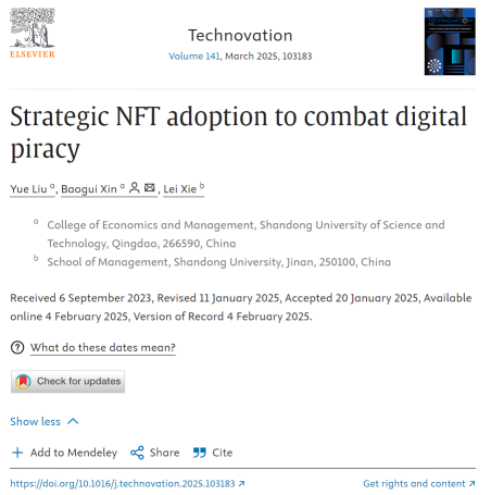 近日,乐动在线登录经济管理学院辛宝贵教授与在读博士生刘悦在《Technovation》发表题为“Strategic NFT adoption to combat digital piracy”的文章。