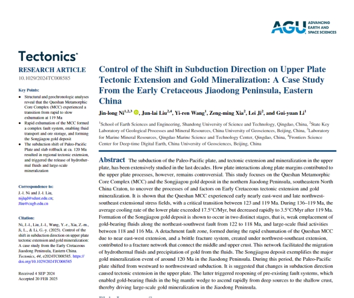2025年3月,乐动在线登录地球科学与工程学院倪金龙教授团队在国际构造地质学知名期刊、美国地球物理学会(AGU)会刊《Tectonics》发表题为“Control of the Shift in Subduction Direction on Upper Plate Tectonic Extension and Gold Mineralization: A Case Study From the Early Cretaceous Jiaodong Peninsula, Eastern China”的文章。